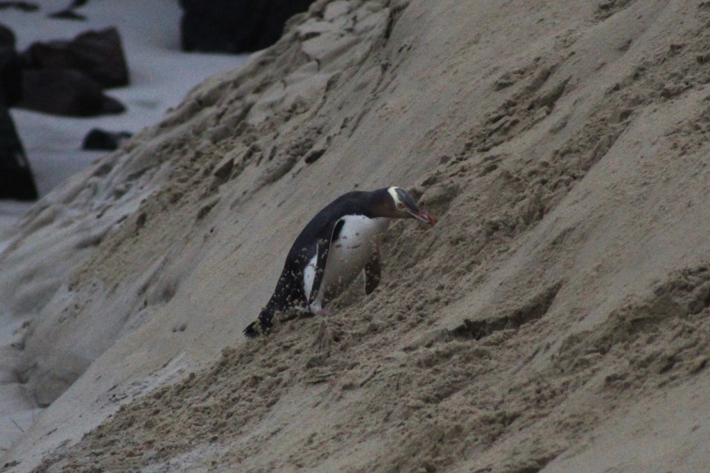 A little disappointed but not discouraged, we made a plan for the next night. We decided to set up this time at Sandfly bay, where we had great luck finding sea lions. Just like the first time we went to Sandfly Bay, there was no shortage of sea lions sleeping in the sand, enjoying the sun. There was a section of the beach that was off limits during a certain time of the year, and I figured that was probably a good indicator that this is where the penguins nest. Once again, around 3:30pm, we climbed up high into the dunes and settled in for a nice long wait. Unlike last night, our wait was rewarded, and we heard a screech from the ocean. There was one singular yellow-eyed penguin, screaming and swimming around in the shore. Some people standing off to the side got excited as the little guy started to emerge from the ocean, and scared him right back into the water. After getting their attention and waving at them to back up, he regained his confidence and waddled out onto the shore. It was very fun watching him climb up the dune to his nest, way up high in the brush.