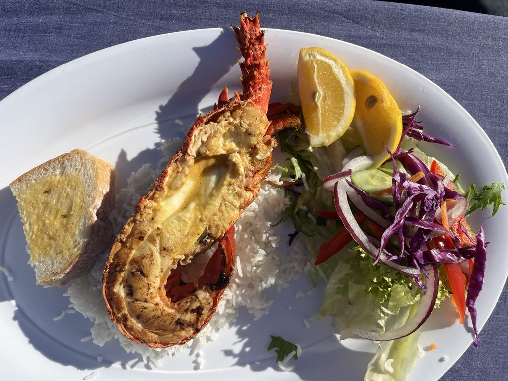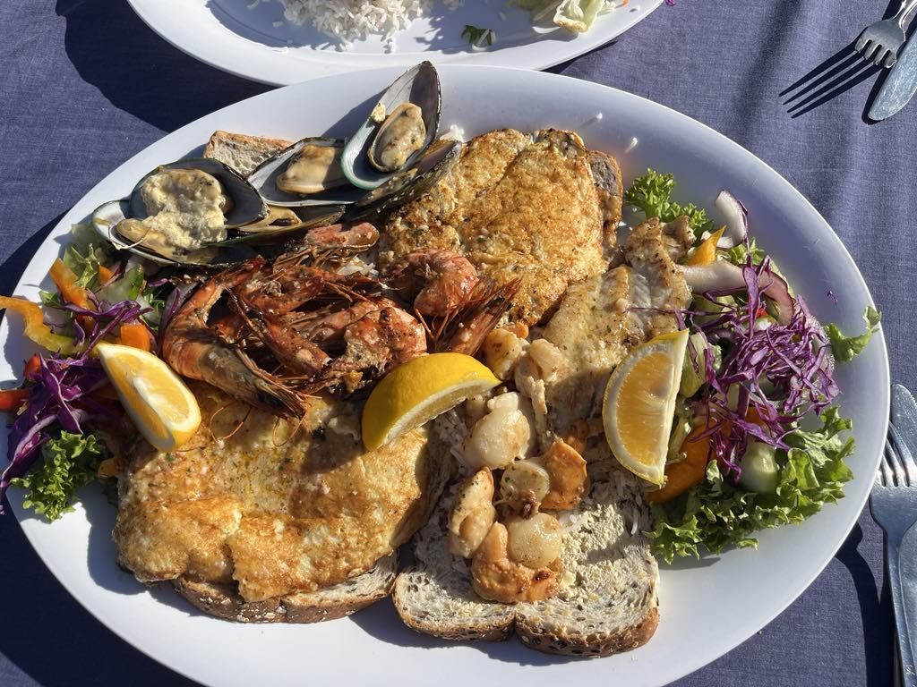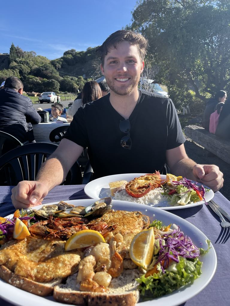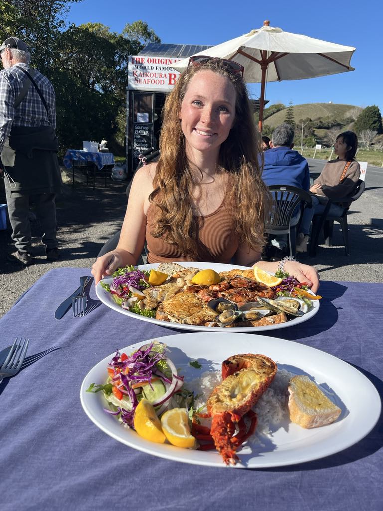 The rocky sea beds that line the coastal town make it a great place for the crayfish. Kaikoura, in Māori, literally means ‘to eat crayfish,’ so it was a delicacy we did not want to pass up on while in town. These crayfish are more like rock lobster to us, and were much larger than any crayfish we would be accustomed to seeing in the States. We ended up going to Kaikoura Seafood BBQ, one of the most famous spots to get these crayfish. Kaikoura Seafood BBQ is a little food truck right on the water, that gets trailered in and out each day. We ended up getting the seafood sampler platter, along with half a crayfish (about the size of a medium lobster – minus the claws). We felt like this would give us the best overall sample of the seafood here. In the platter, we got scallops, green shell mussels, prawns, a piece of whitefish, a crayfish fritter, and a baitfish fritter. Everything, in addition to the crayfish, was delicious. We were incredibly happy with all of it, and I think we would do the exact same thing if we went back! The crayfish was probably my favorite part, and the meat was sweet and similar to that of a lobster.