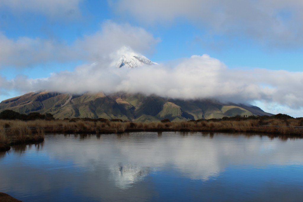 When we started the hike, it was just getting light out, but we could tell we already had some clouds – not good. It took us just over two and a half hours to make it all the way up to the tarns, the entire time we were eyeing the skies hoping the clouds would clear up. Sadly, the more we hiked, the cloudier it seemed to get. As we crested the hill and caught our first glimpse of the big volcano for the day, we just saw clouds (Eric jokes that Taranaki translates to “Cloud Magnet” – it does not). We made our way to the tarns and sat on some makeshift benches they had there. The wind was picking up, which was good because it might clear some clouds, but bad for getting a reflection off the tarn. After being incredibly patient, we were able to capture several good photos, and the clouds moved just enough out of the way for us to see Taranaki (for roughly 6 minutes), although they never completely left our view.