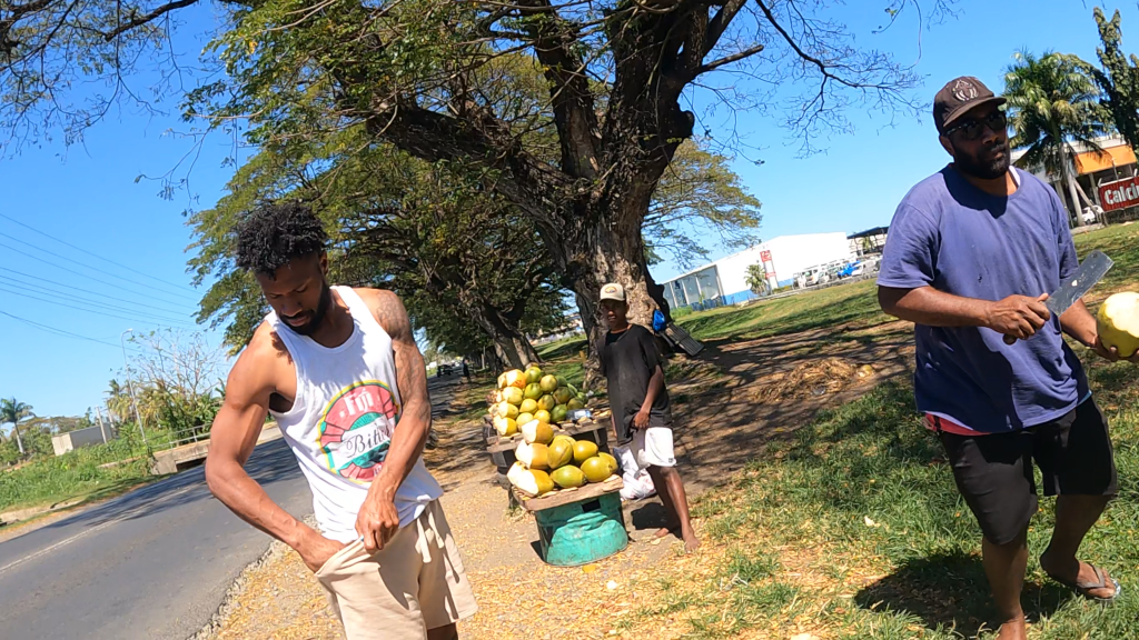 We took a cab with Luke to Lautoka, where we would hop on a bus to Rakiraki town, before taking another cab to the Rakiraki village, where Luke’s parents lived. On this first cab ride, we stopped once along the side of the road (at Luke’s insistence), for some roadside coconut water. We watched the men open up the coconuts for us and we brought them with us in the cab the rest of the way into Lautoka. Luke said that these were not quite ready, and that when we made it back to his parent’s place, he would get us some super sweet coconuts from their coconut trees. We walked around the market in Lautoka for a little while while we waited for our bus, and snacked on some pineapple on a stick (it was delicious).