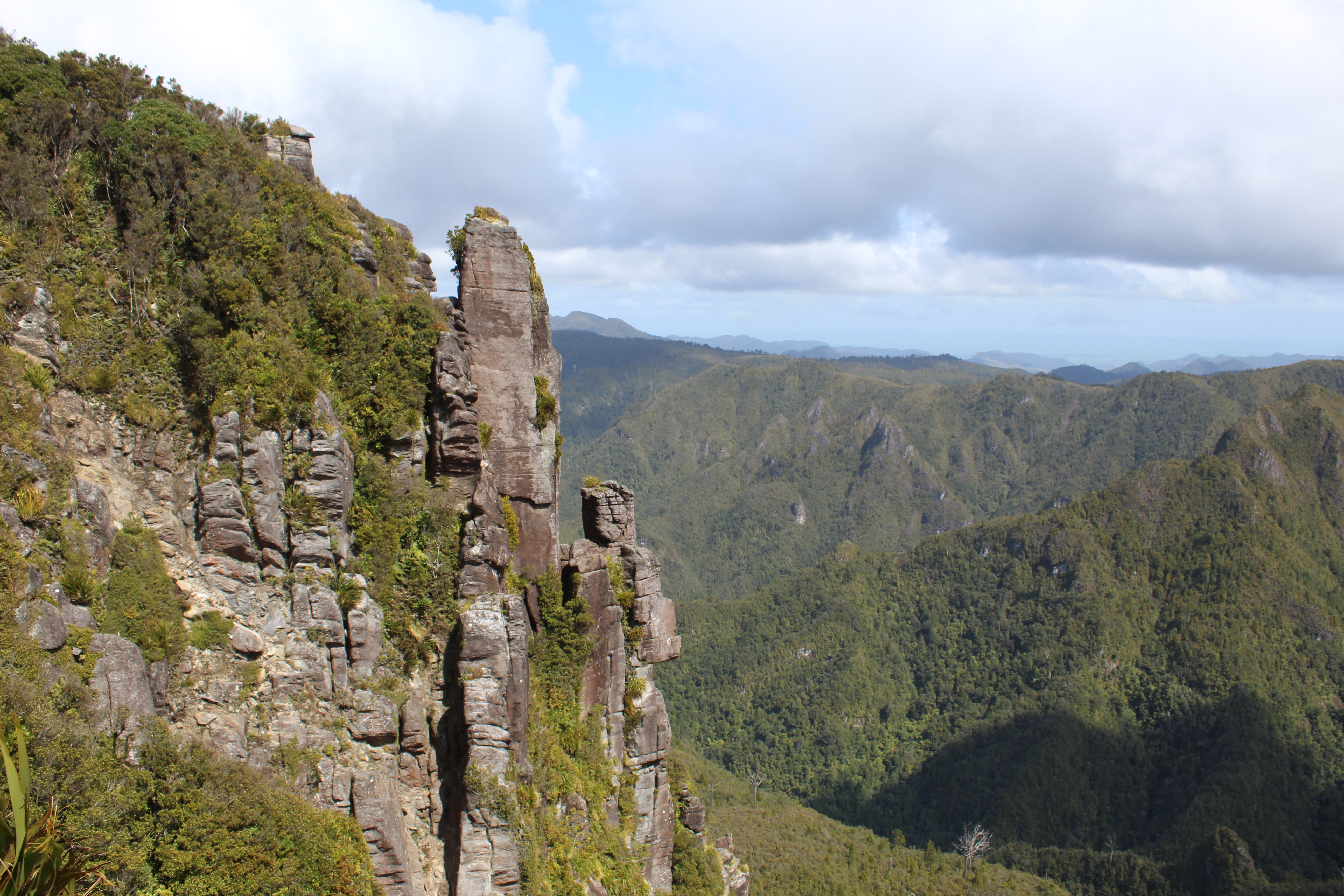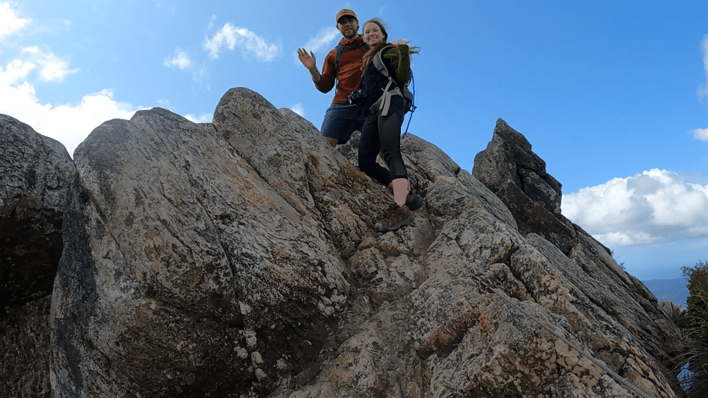 Eventually, we made it up and out of the forest and the hut at the base of the Pinnacles was in our sight. This is where we were planning on stopping for lunch before making the final stretch up to the Pinnacles themselves. As soon as we were out of the forest, the views were amazing. Not only could you really see the Pinnacles, you were also greeted with gorgeous views of the Coromandel Peninsula, and we could even see all the way out to the ocean! On top of all of that, this hut was definitely the nicest hut that we have come across so far, making it the perfect spot to take a little lunch break. It seems like a lot of people hike to the hut in the afternoon, and then do the hike up to the Pinnacles for either sunset, sunrise, or both, before descending back down.